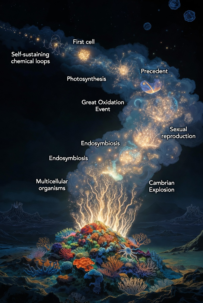 Prvi presedan događa se prije otprilike 4,0 do 3,8 milijardi godina, kada nastaju prve samoodržive kemijske petlje – molekularni procesi koji proizvode vlastite komponente. To još nije život u klasičnom smislu, ali jest prvi autopoetski presedan: proces koji se sam reproducira i sam gradi.
